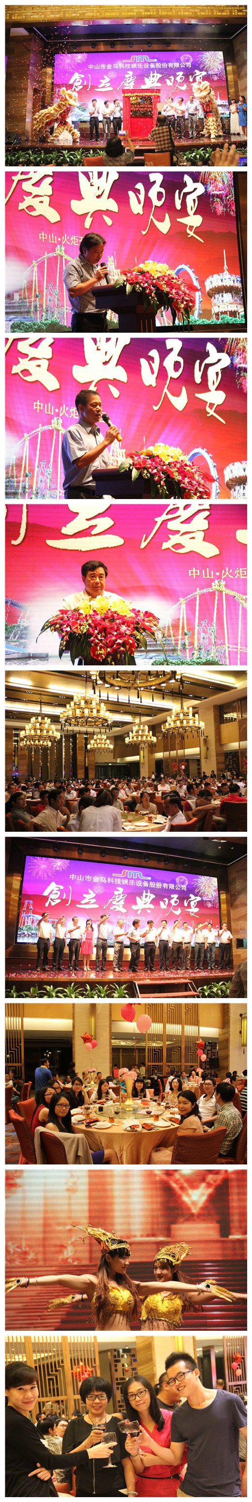 晚上19時,在一片喜慶熱烈的龍獅舞動中,慶典活動正式拉開帷幕。首先由鄧志毅董事長上臺致辭,他深情答謝各界人士的鼎力支持及金馬人的拼搏奮斗,并滿懷激情鼓舞公司上下攜手共進(jìn),以產(chǎn)品創(chuàng)新、管理創(chuàng)新、經(jīng)營創(chuàng)新共筑金馬游樂王國夢!隨后,火炬開發(fā)區(qū)管委會總經(jīng)濟師梁紹華先生發(fā)表致辭,他對金馬落戶火炬所起的龍頭帶動作用表示高度認(rèn)可,并對公司未來發(fā)展寄予厚望。緊接著,原政協(xié)副主席、金馬游藝創(chuàng)始領(lǐng)導(dǎo)李武彪先生上臺講話,他為現(xiàn)場觀眾娓娓道來金馬走過來的發(fā)展路,并寄語金馬以創(chuàng)新引領(lǐng)中國文化裝備制造位居世界前列。此后,慶典活動進(jìn)入最激動人心的時刻——中山市金馬科技娛樂設(shè)備股份有限公司揭牌儀式!在到場的領(lǐng)導(dǎo)、嘉賓及金馬人的見證下,各轄區(qū)領(lǐng)導(dǎo)、李主席及鄧總共同手?jǐn)y紅線,帷布徐徐拉開,金馬股份公司正式揭牌!在龍獅獻(xiàn)瑞、鑼鼓祥鳴中,大家都送去了激動、祝賀的掌聲,祝愿金馬加快與資本市場對接,早日上市實現(xiàn)金馬游樂王國夢!在隨后的祝酒環(huán)節(jié)中,鄧總領(lǐng)銜公司高管、老領(lǐng)導(dǎo)上臺,祝愿到場領(lǐng)導(dǎo)、嘉賓、金馬人步步高升、萬事如意,祝愿金馬事業(yè)興旺騰飛!在《好日子》的樂聲中,晚宴正式開始,現(xiàn)場好不熱鬧,臺上舞蹈翩躚、鼓舞飛揚,臺下暢懷歡聚、喜逐眉梢,與會人員度過了一個美好的夜晚。