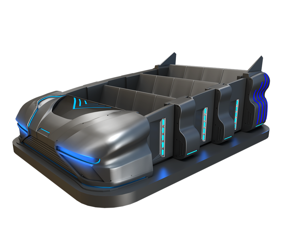 車體設(shè)計上,車輛結(jié)構(gòu)輕巧、緊湊(承載人數(shù)12人/車),行走軌跡可隨意設(shè)定,且轉(zhuǎn)彎半徑小,可實現(xiàn)直角轉(zhuǎn)彎;車輛外觀富有科技感的配色及戰(zhàn)船造型,搭配炫彩的科技藍燈帶,貼合項目主題,營造滿滿的沉浸式科技氛圍。