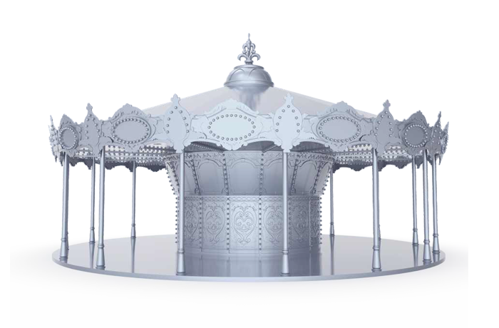 轉(zhuǎn)馬采用動(dòng)物音樂(lè)會(huì)裝飾主題,轉(zhuǎn)臺(tái)周邊鑲嵌彩色花草圖案,搭配有音樂(lè)符號(hào)的裝飾花板,并配以變幻的燈彩。轉(zhuǎn)臺(tái)上有吹奏彈唱的各類(lèi)小動(dòng)物坐騎、造型別致的馬車(chē)。游客踏上轉(zhuǎn)馬,猶如踏入了小動(dòng)物們的狂歡派對(duì)之中。