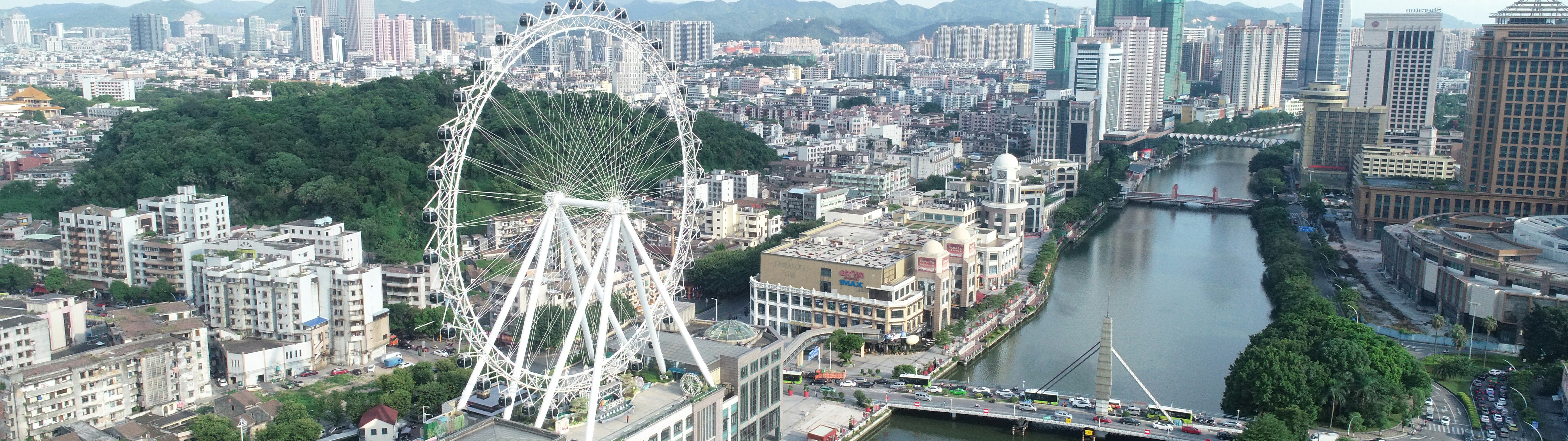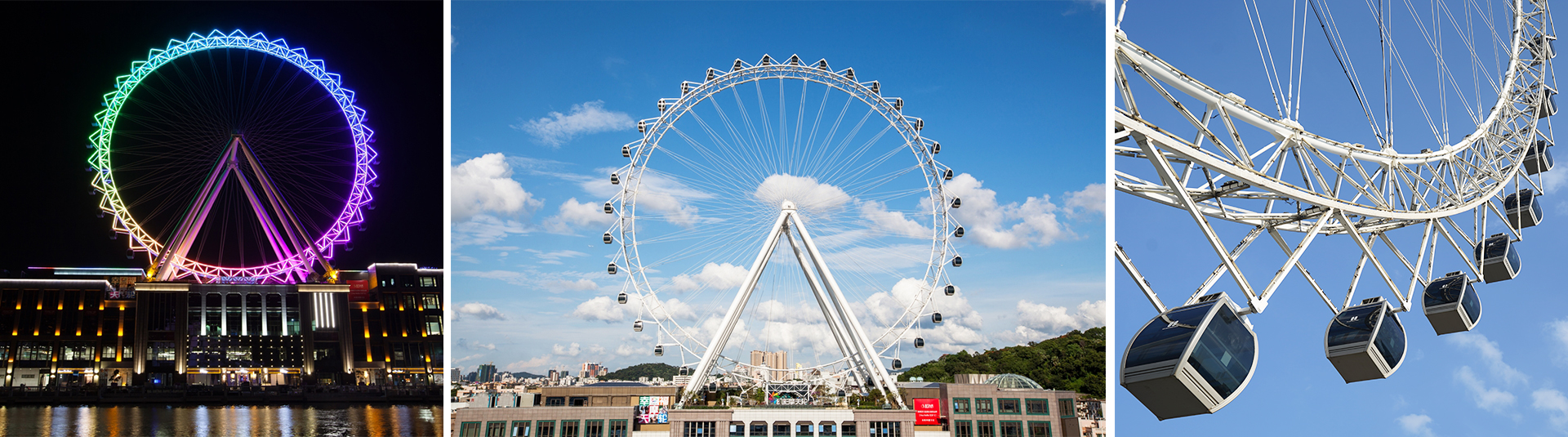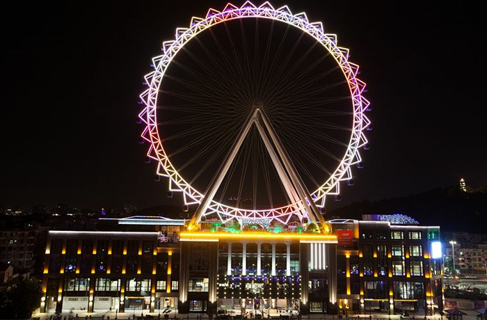 觀覽?是?套?于樓頂經歷強臺?“天鴿”襲擊,仍“巋然不動”,安全使?。塔架采?圓管?字?柱結構,轉盤為輻條式,吊廂懸掛在轉盤的外側?撐架上,造型獨特新穎,轉盤結構通透。達到?點時,距離地?的?度可達到108?,將乘客帶到?覽?遺的天空之上,俯視?圓10公?以內的景致。