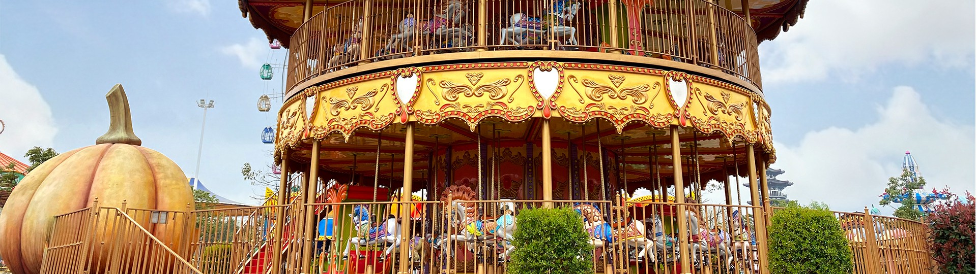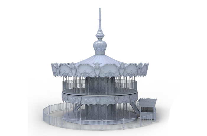 豪華雙層轉(zhuǎn)馬是上、下層可單獨(dú)作旋轉(zhuǎn)運(yùn)動(dòng)的裝飾豪華的轉(zhuǎn)馬,采用歐洲皇家的古典豪華的裝飾風(fēng)格。蓬頂?shù)幕使诩馑睕_云宵,天花板、內(nèi)圍板鑲嵌著彩色浮雕,并配備彩燈。馬匹及宮庭式馬車結(jié)合多彩的花飾,造型奢華大氣流光溢彩。