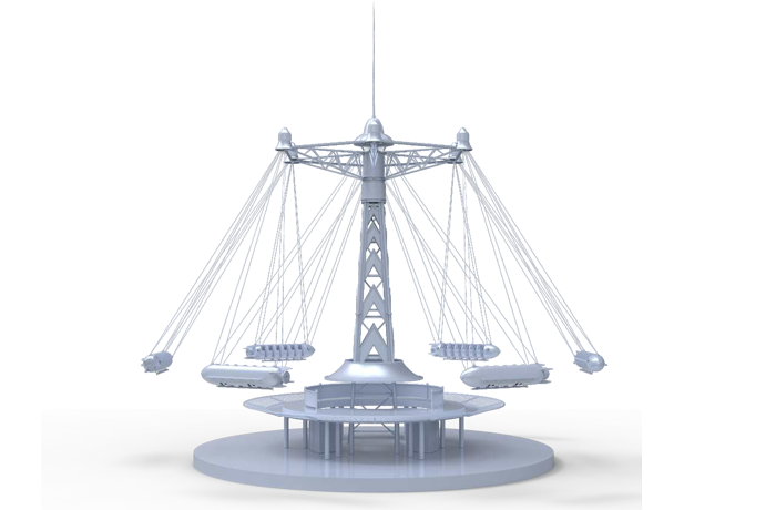 幻速追影六個飛機吊掛座艙隨同旋轉(zhuǎn)架相對塔體自由旋轉(zhuǎn)并外擺升起,繞中心立柱飛行,科幻又刺激。夜間智能燈光系統(tǒng)亮起,成為樂園一道的奇趣風(fēng)景線。