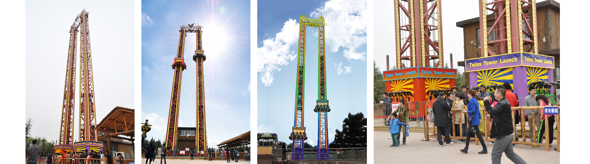 雙塔太空梭以雙塔為造型,設(shè)備整體由發(fā)射塔和速降塔組成。座艙在鋼絲繩的牽引下沿著豎直的立柱軌道作上升、下降運(yùn)動(dòng),使乘客在超重與失重的過程中體驗(yàn)加速度升降樂趣。