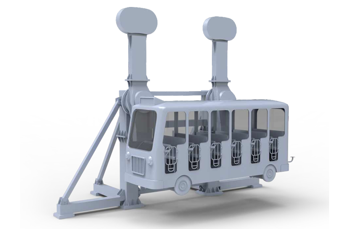 瘋狂巴士配備雙向可逆無級自動(dòng)調(diào)速系統(tǒng),經(jīng)過減速、分速等一系列機(jī)構(gòu),實(shí)現(xiàn)一臺(tái)電機(jī)帶動(dòng)兩個(gè)驅(qū)動(dòng)臂的擺動(dòng),帶動(dòng)巴士的平動(dòng),巴士在電氣系統(tǒng)的控制下可以實(shí)現(xiàn)正反兩種通過最高點(diǎn)的運(yùn)動(dòng),給乘客以歡樂搖擺的體驗(yàn)。