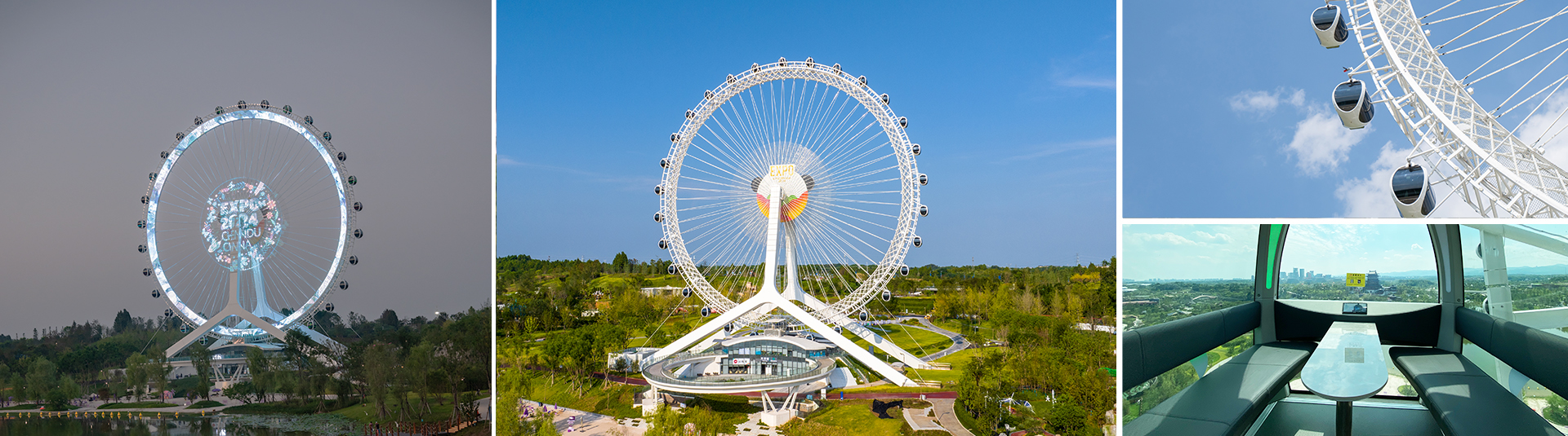 觀覽??架主??為?字形結(jié)構(gòu),轉(zhuǎn)盤為全纜索結(jié)構(gòu),由滾道和鋼纜組成。整體結(jié)構(gòu)科學(xué)合理,外觀簡潔??,充滿了科技感與?量感。觀覽?設(shè)置了30個轎廂,每個可載客8?。為了增添游客的舒適度,轎廂還配備了空調(diào)系統(tǒng)、藍??響、?線對講機、氛圍燈及內(nèi)飾座椅,在保障安全性的前提下,更具現(xiàn)代感,也更加?性化。