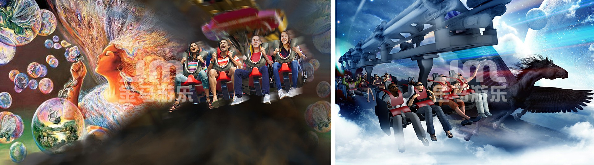 自帶動力的懸掛式過山車實現(xiàn)了在軌道任意位置變換速度,時速可高達(dá)32km/h,在高清電影、科技特效的影視相融合下,使乘客完全沉浸在游戲的樂趣和刺激中