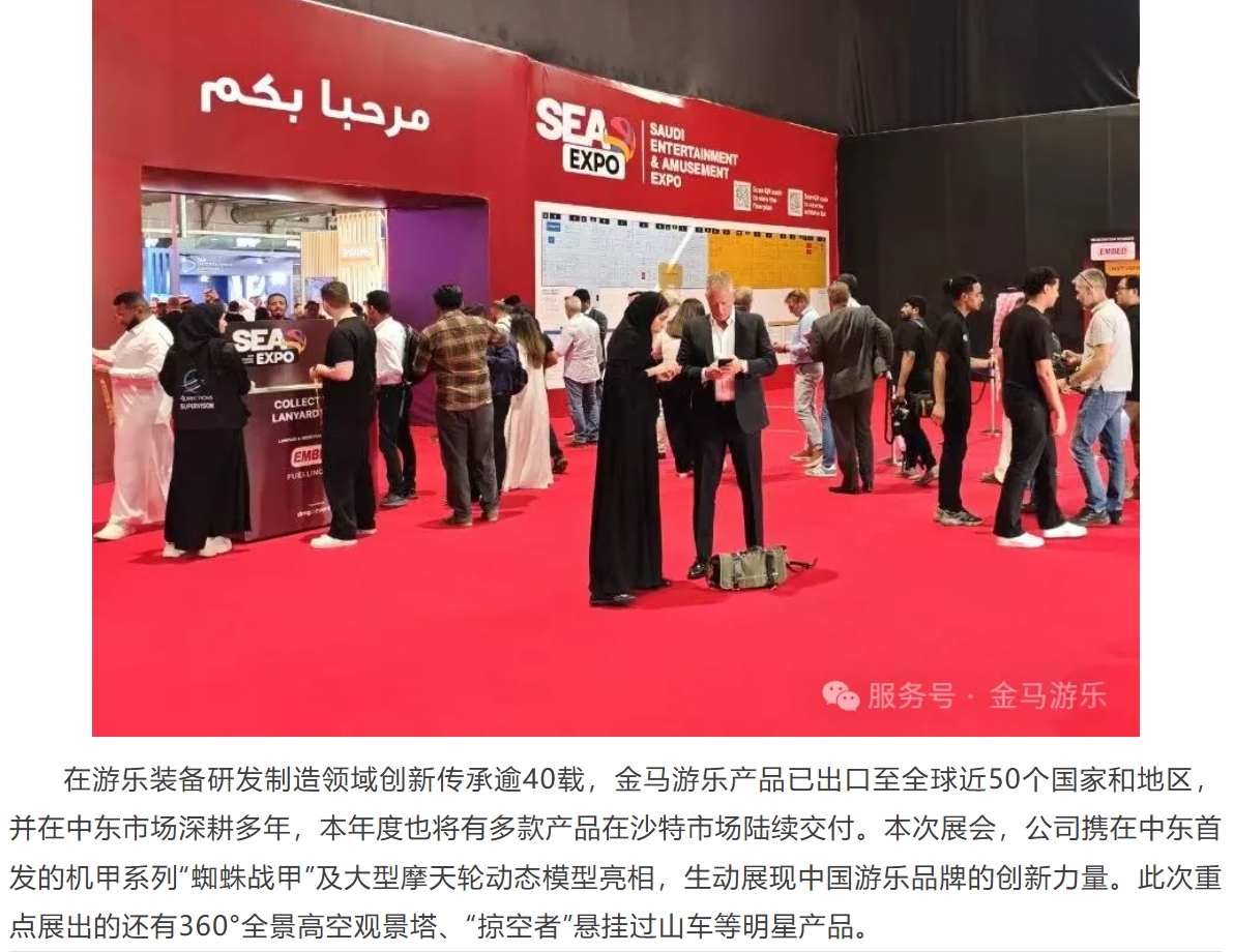 5月20日,全球游樂(lè)行業(yè)焦點(diǎn)之一的2025 SEA沙特展在沙特利雅得前沿會(huì)展中心盛大開(kāi)幕。隨著“沙特2030愿景”加速推進(jìn),中東文旅產(chǎn)業(yè)將迎來(lái)黃金發(fā)展期。金馬游樂(lè)搶抓市場(chǎng)機(jī)遇,攜高品質(zhì)創(chuàng)新產(chǎn)品與全球服務(wù)方案閃耀亮相本次展會(huì),與全球伙伴共拓中東千億級(jí)市場(chǎng)新機(jī)遇!